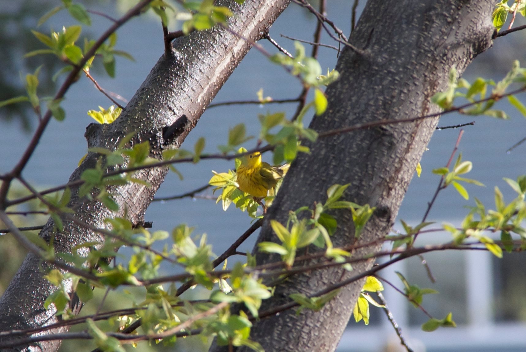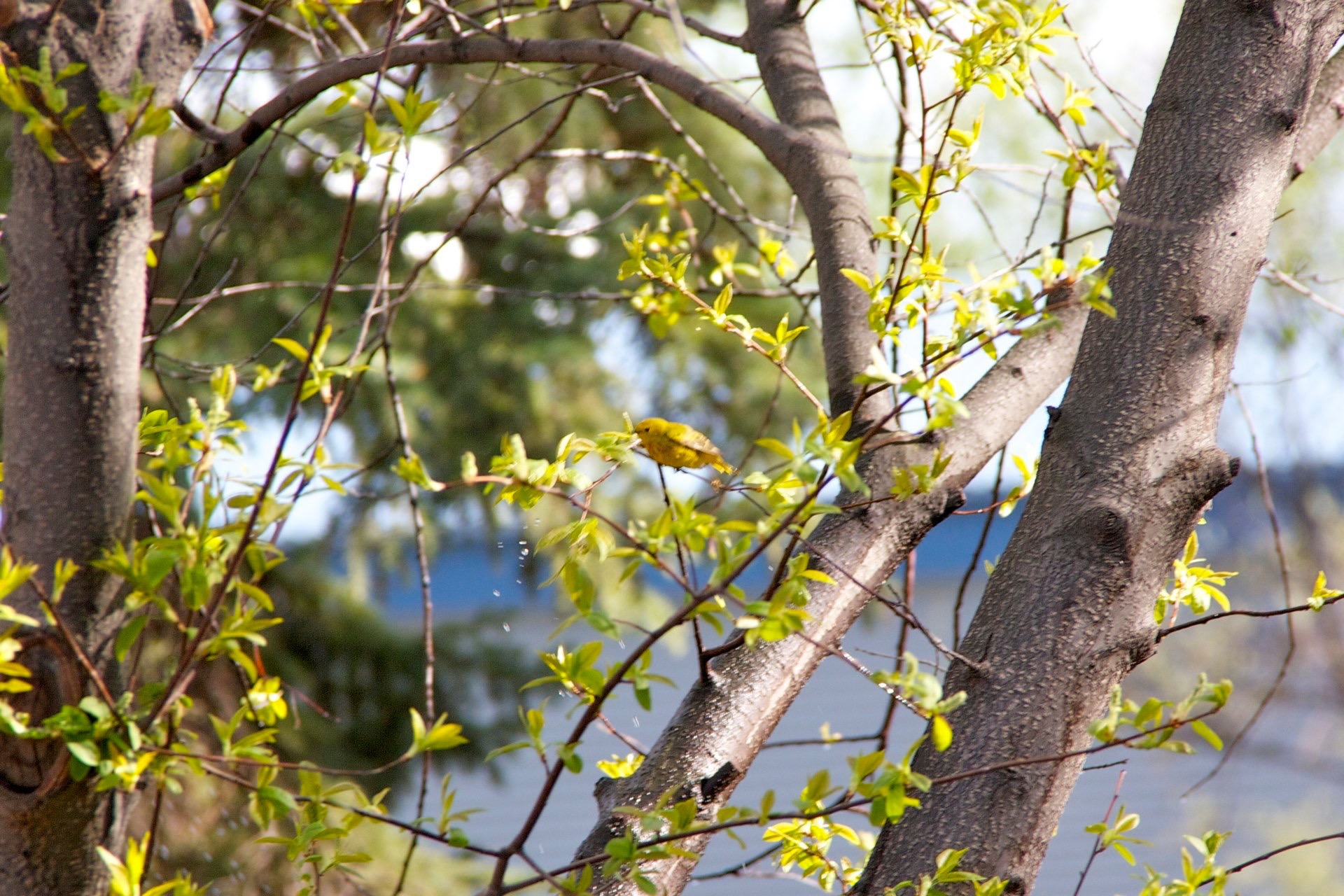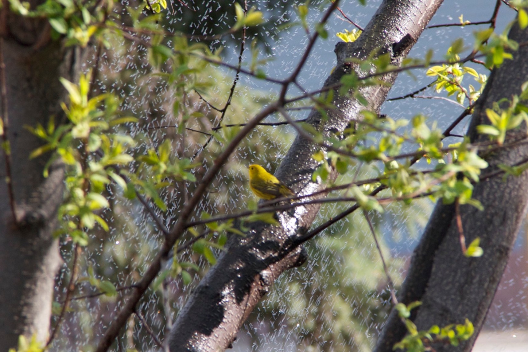 We were out watering the lawn when this yellow warbler showed up and started cavorting in the spray. Apparently it was rather thirsty. You have to look closely at some of these photos- it hides rather well :)