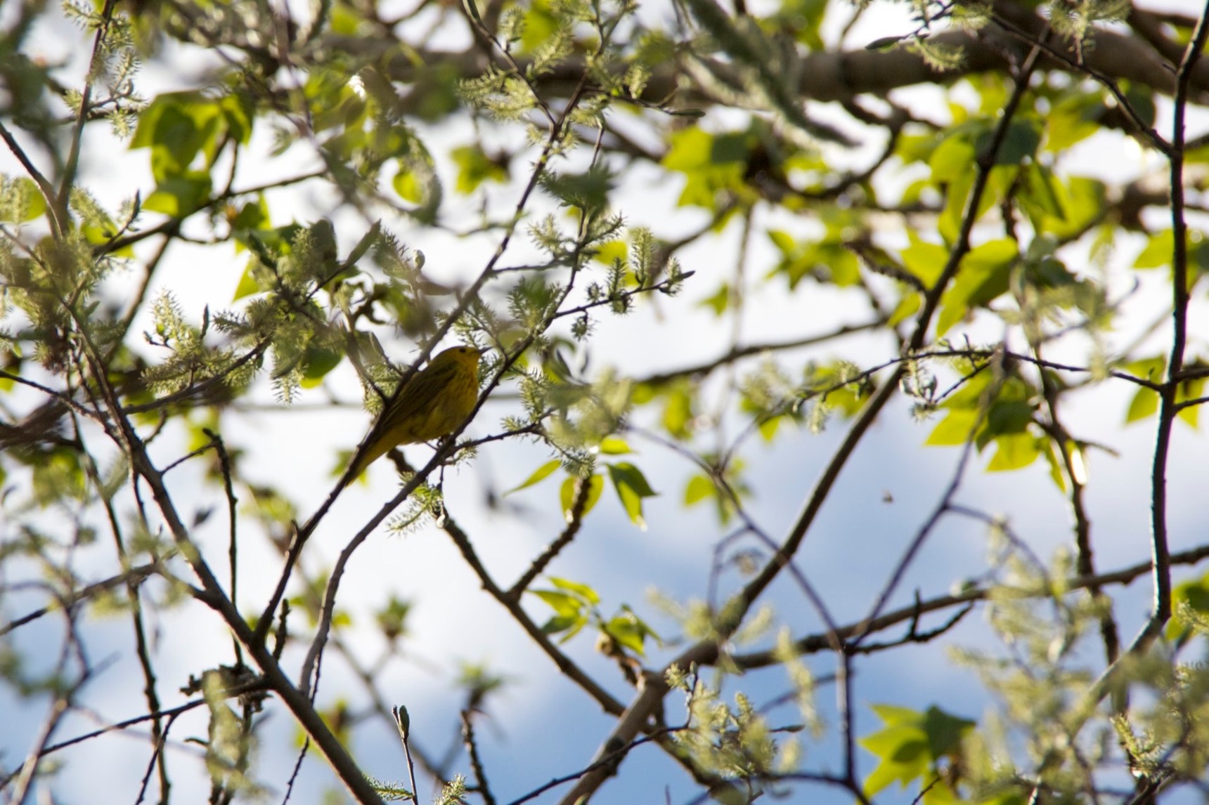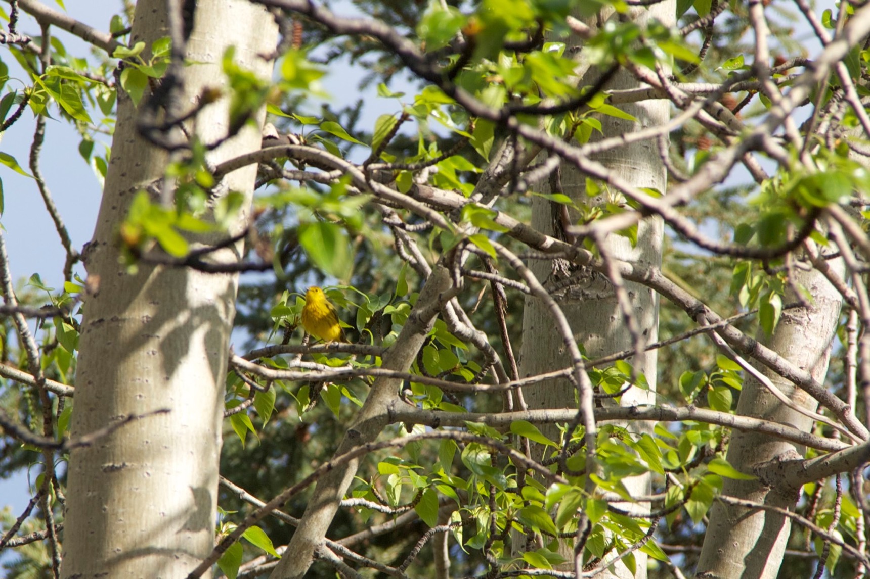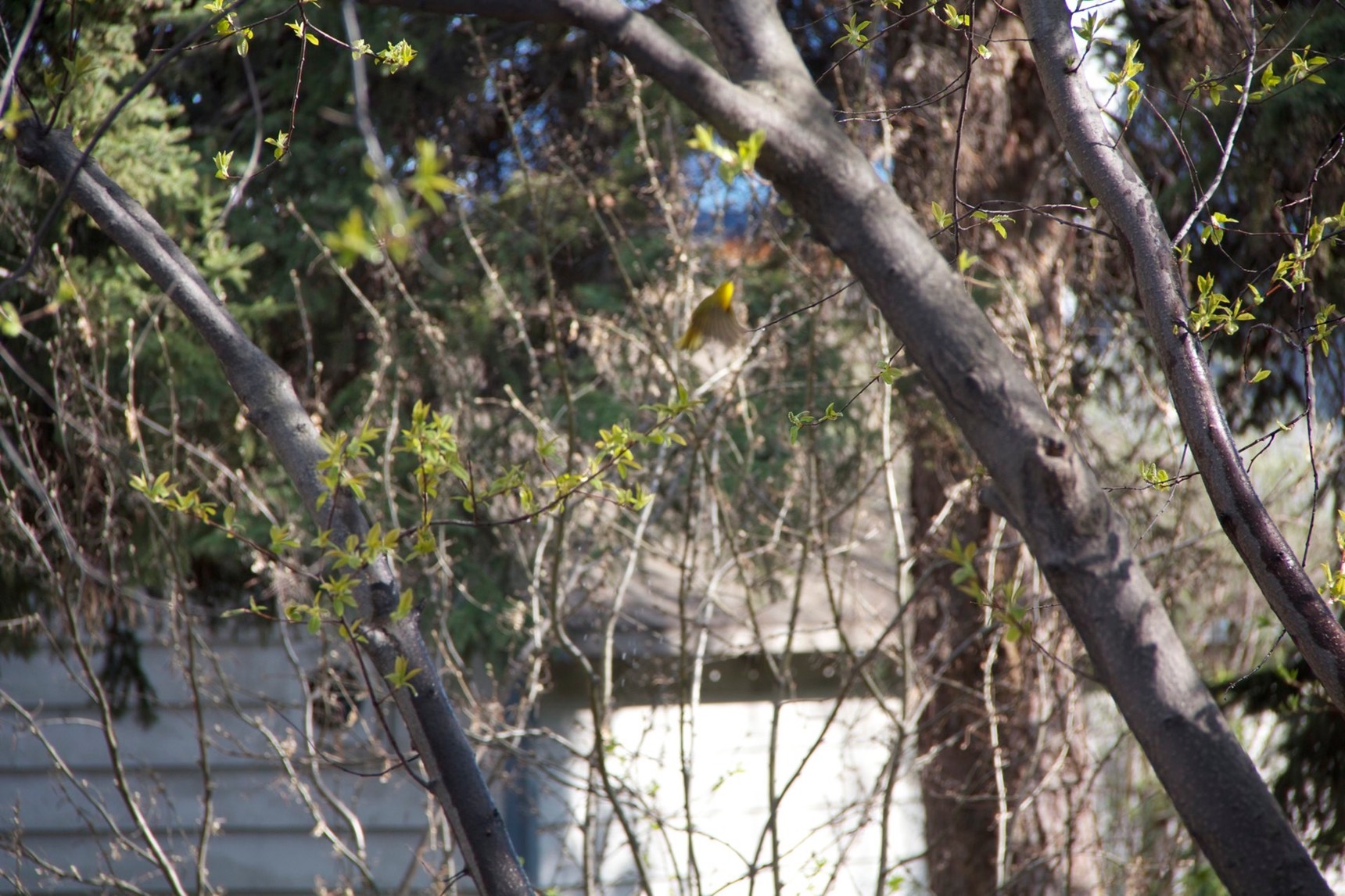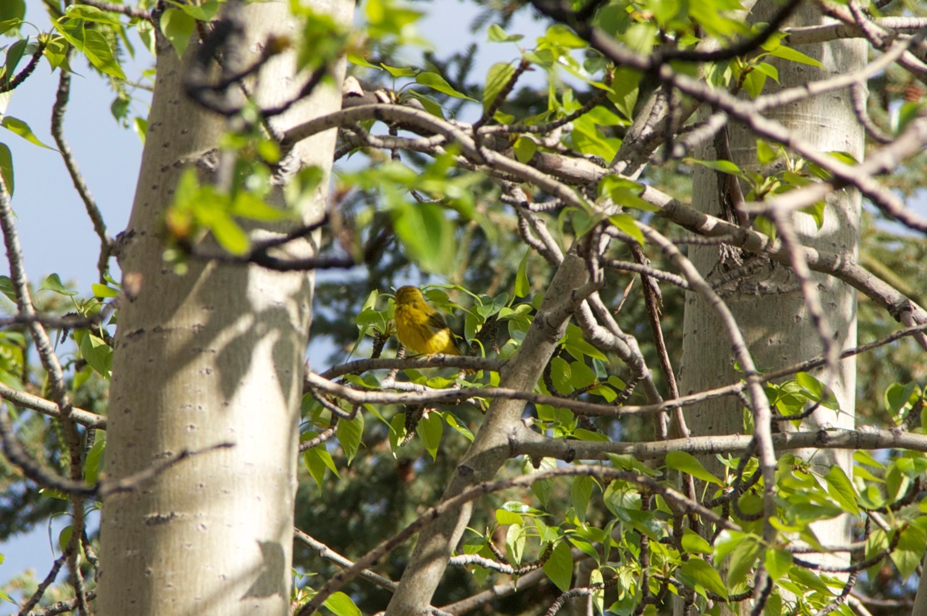 We were out watering the lawn when this yellow warbler showed up and started cavorting in the spray. Apparently it was rather thirsty. You have to look closely at some of these photos- it hides rather well :)